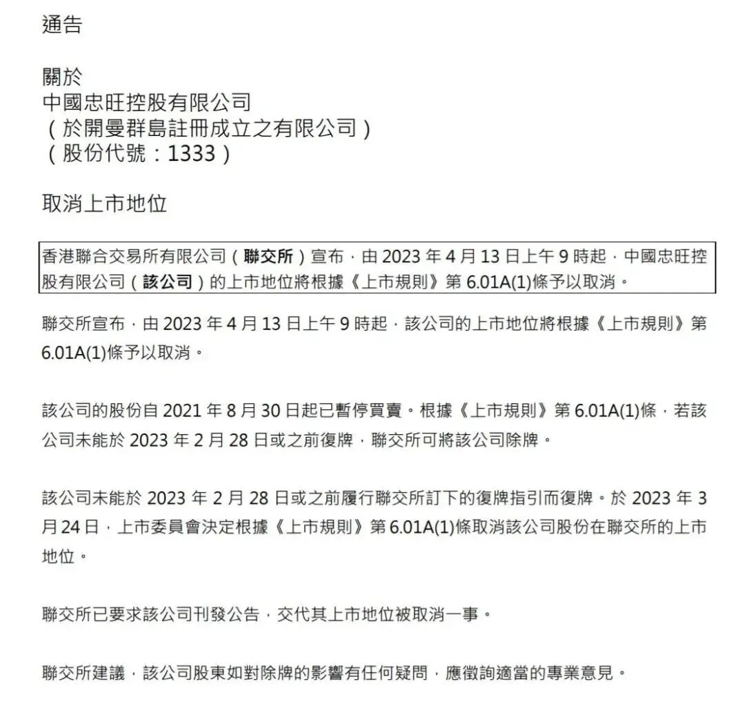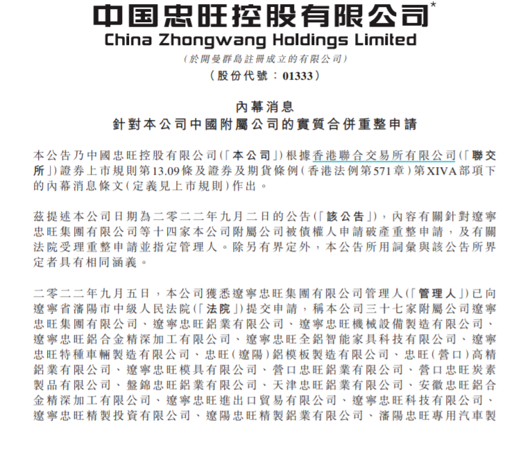 由于财务不达标,中房股份于2021年4月正式“披星戴帽”。中房股份2021年8月11日发布《关于终止重大资产重组事项》等11则公告;同日,中国忠旺披露《终止建议通过分拆辽宁忠旺与中房置业进行资产重组》的公告。双方公告称,鉴于当时市场环境等原因,经双方友好协商,决定终止该重大资产重组事项。借壳回“A”失败不久,作为曾经的重组双方,中房股份已于2022年6月21日被上交所予以摘牌。中国忠旺也发布了停牌公告,一直未再恢复交易,同时也未再披露过公司业绩情况;同时,中国忠旺也已接获香港联交所通知,公司股份最后上市日为2023年4月12日。2022年9月,中国忠旺公告,相关债权人针对其附属14家公司向沈阳市中级人民法院提交破产重整申请。2022年9月20日,中国银保监会作出对忠旺集团财务有限公司破产的批复,同意该公司进入破产程序。
