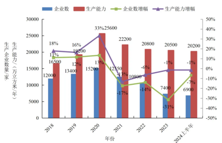 建筑模板是现浇混凝土成型的工具,在我国工程建设中用量巨大。建筑模板用胶合板又称“木模板”,是建筑模板中用量最大的产品,占比高达65%以上。木模板广泛应用于建筑工程、桥梁工程、高速铁路、公路、隧道、核电、水电、市政工程等工程施工中。2024年上半年,我国胶合板类产品生产企业6900余家,分布在27个省市区,总生产能力约2.02亿立方米/年。胶合板产业从2020年的高峰期至今,呈下降态势,企业数量下降了54.6%, 生产能力下降了21.1%。