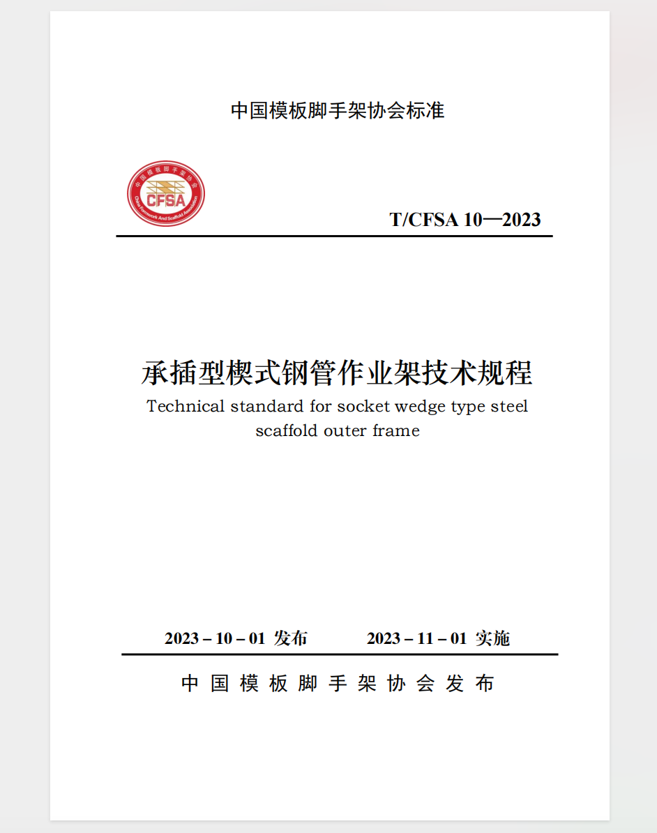 由九创公司主编的中国模板脚手架协会标准《承插型楔式钢管作业架技术规程》已通过专家审核,现予批准发布。编号为 T/CFSA 10—2023,自 2023 年 10 月 1 日发布,2023 年 11 月 1 日实施。